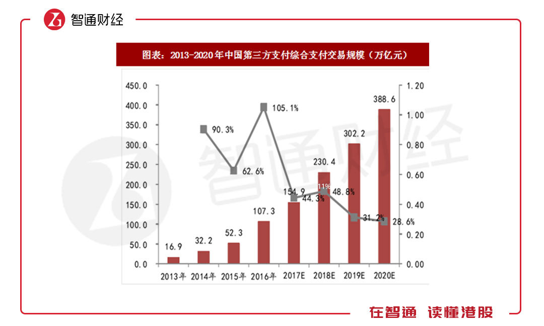 随行付有如此的增长业绩得益于支付行业的高速增长,2016年第三方支付综合支付交易规模达107.3万亿元,同比增长105.1%,近四年符合增长率58.7%,有机构预计到2020年交易规模将达到388.6万亿元,复合增长率为29.4%。增速虽有所回落,但行业依然是高增长的状态。