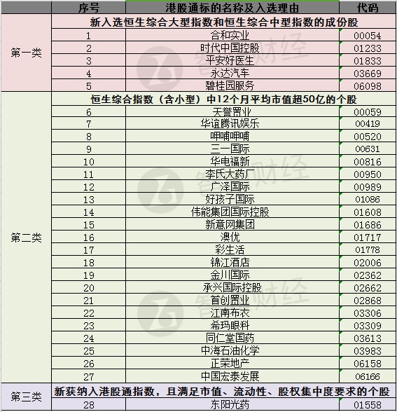 智通财经根据恒指公司公布的综合指数变动及港股通指数变动情况,并结合各券商机构预测,梳理出最有可能新加入港股通标合计28只,供投资者参考,准确的港股通变动名单请以港交所、上交所、深交所官方公布为准。