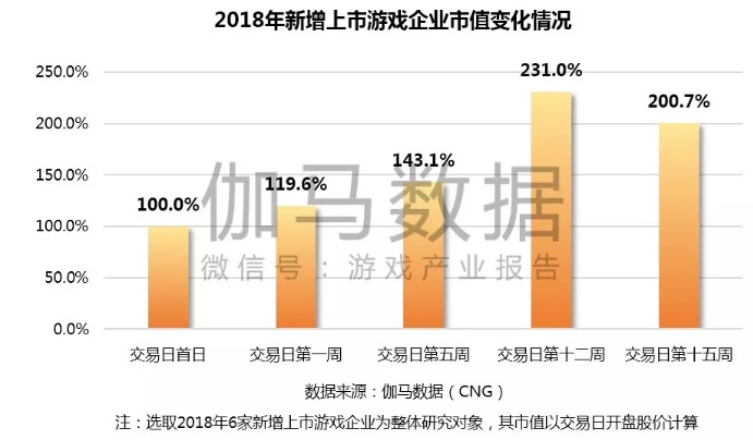 相较于上市游戏企业,同等收入的准上市游戏企业估值普遍偏低,这与其股权流通性不足有关。这种情况在企业上市后将会发生变化,一方面,部分准上市游戏企业拥有独特的竞争力,促使相关企业业绩持续向好,最终影响估值;另一方面,从游戏企业历史表现来看,准上市游戏企业在完成上市后,也将有望实现估值的逐步增长。据伽马数据(CNG)监测,2018年6家新增上市游戏企业上市后整体市值均有所提升。