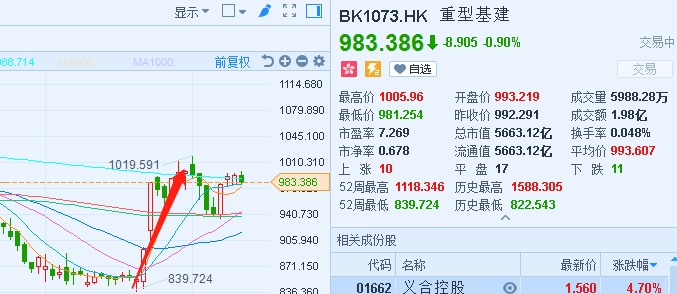 为消除投资增速下滑对下半年经济可能形成的拖累,加大基建领域投资,补基建增速短板已成为了当前深化供给侧结构性改革的重点任务。受此利好消息影响,港股基建板块大幅拉升,短短数日指数从839.7点最高上升至1019.6点,涨幅超20%。