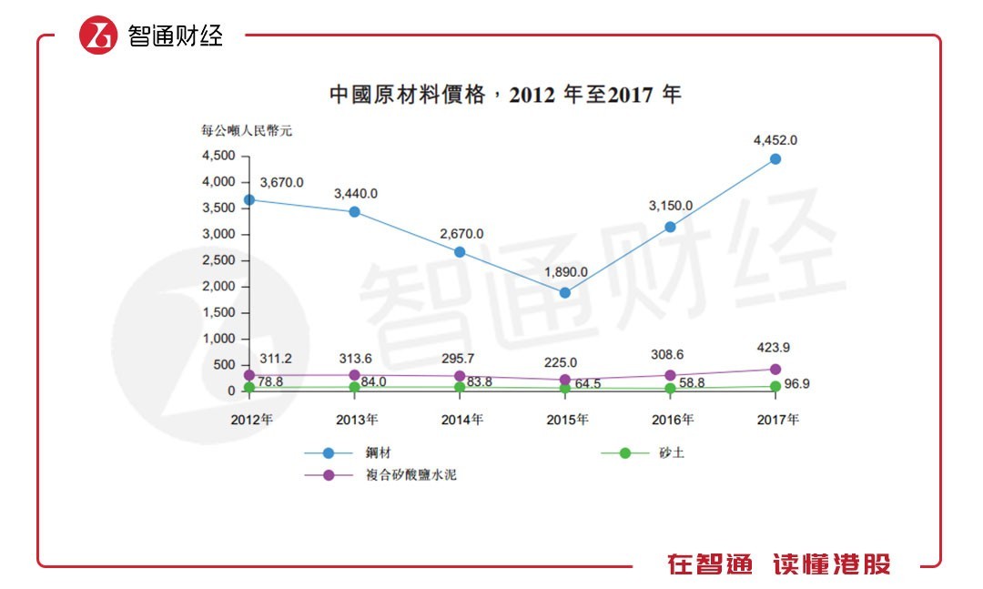 其二,销售成本中最大的比重逐渐由分包成本向原材料及消耗品成本转移,这说明原材料成本上升。2015-2017年,我国钢材价格由1890元每吨涨至4452元每吨,若钢材价格持续上涨,或将影响公司的盈利能力。