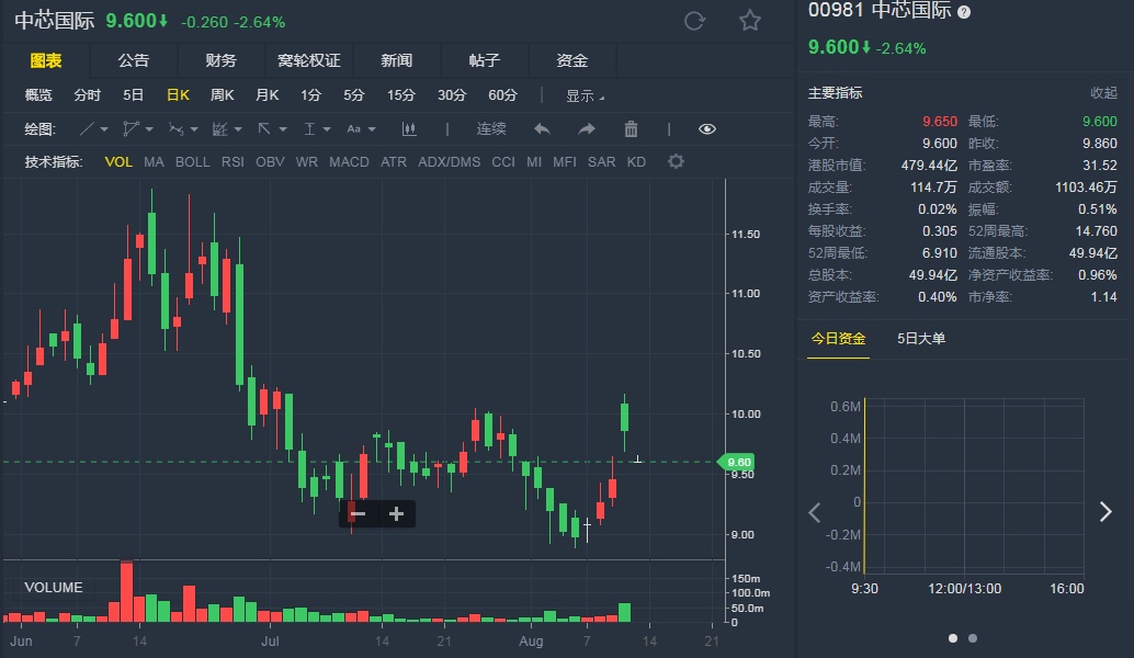 截至8月13日,中芯国际(00981)跌2.64%,报9.6港元。