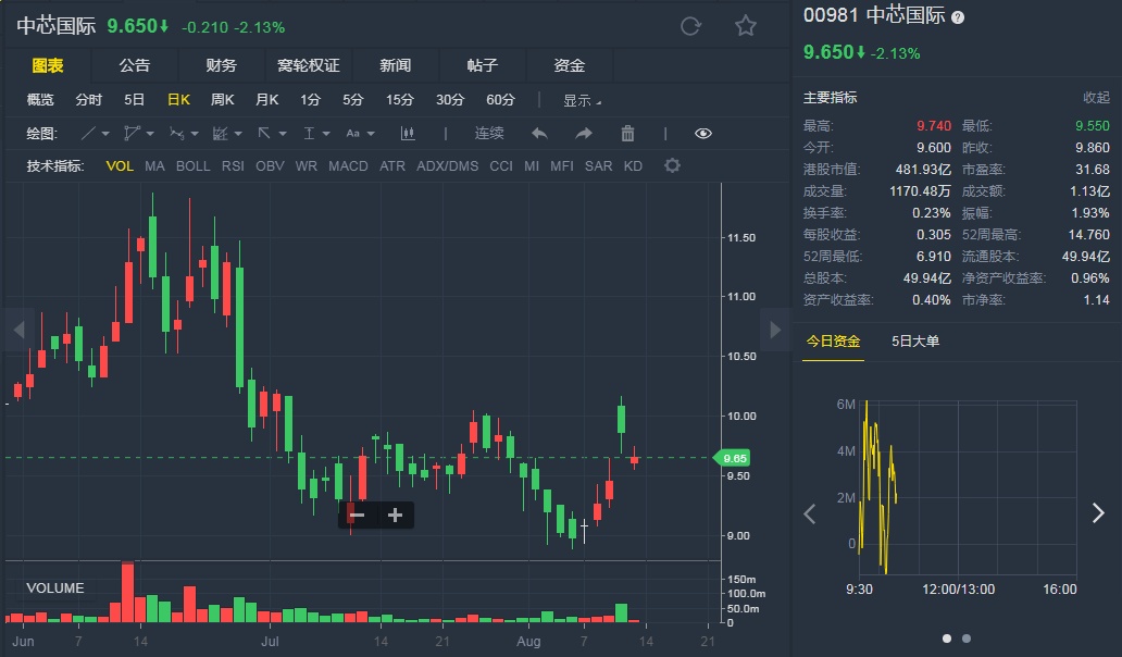 截至8月13日,中芯国际(00981)跌2.13%,报9.65港元。