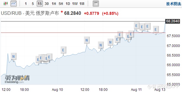 除股市外,俄罗斯卢布兑美元开盘跌1.2%,创2016年4月以来新低,目前报价68.284,跌0.5779或0.85%。