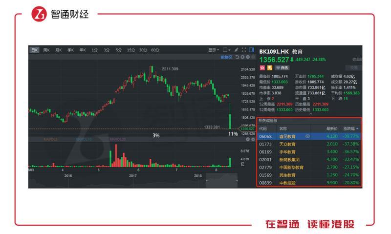 8月13日,港股教育行业指数一度跌破20%,个股全线暴跌,K12教育个股领跌,截至收盘,行业指数跌24.88%,其中睿见教育(06068)跌39.77%,,天立教育(01773)跌37.38%,宇华教育(06169)跌36.57%,可以称得上是港股教育行业的“黑色星期一”了。