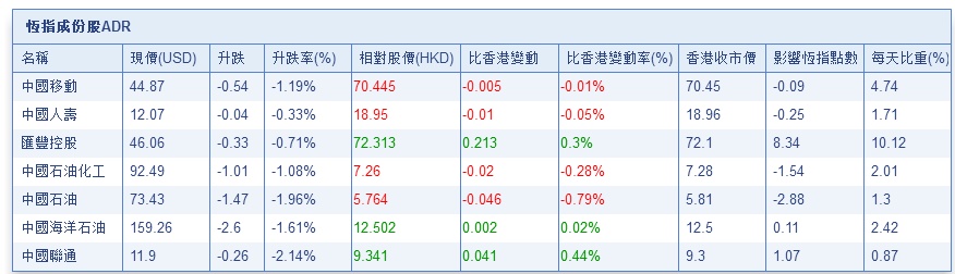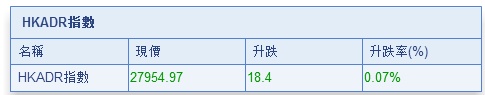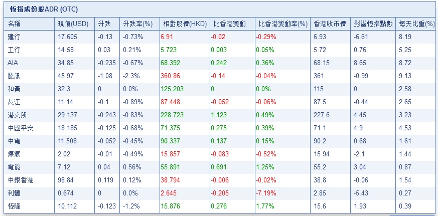 智通财经APP获悉,隔夜港股ADR出现些微升幅。截至8月13日美股收盘,按比例计算,收报27954.97点,升18.4点或0.07%。主要蓝筹靠稳,汇丰控股收报72.31元,较港收市升0.21;港交所收报228.72元,较港收市升1.12;腾讯控股收报360.86元,较港收市跌0.14元。