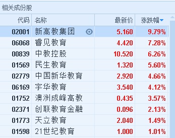 智通财经APP获悉,教育板块因8月10日公示的《民办教育促进法修订案》(送审稿),昨日整体重挫,今日现反弹。截至9时40分,新高教集团(02001)涨9.79%,报价5.16港元,睿见教育(06068)涨7.28%,报4.42港元,中教控股(00839)涨6.26%,报10.52港元,中国新华教育(02779)、宇华教育(06169)涨逾4%。