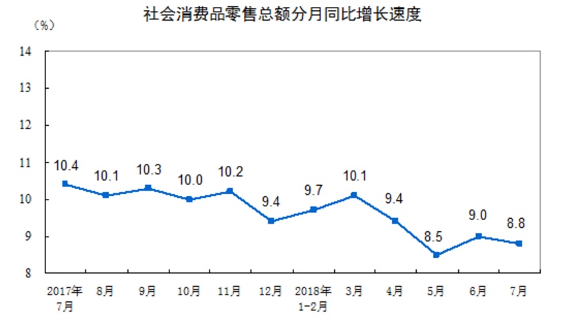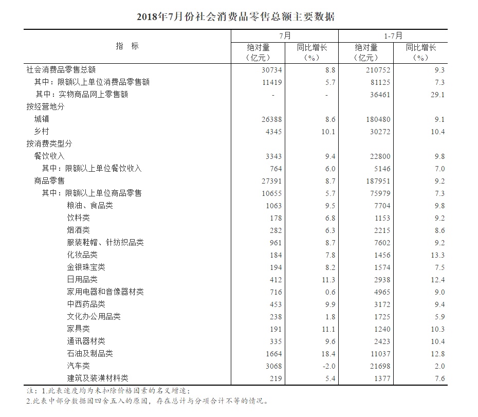 智通财经APP获悉,国家统计局今日发布数据表示,2018年7月份,社会消费品零售总额30734亿元,同比名义增长8.8%(扣除价格因素实际增长6.5%,以下除特殊说明外均为名义增长)。其中,限额以上单位消费品零售额11419亿元,增长5.7%。