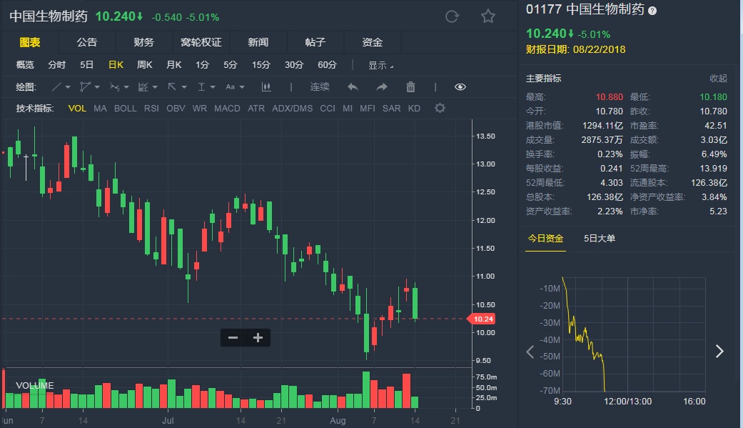 截至8月14日,中生制药(01177)跌5.01%,报10.24港元。