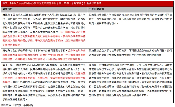 中国司法部8月10日公布的《中华人民共和国民办教育促进法实施条例(修订草案)(送审稿)》中表明,实施集团化办学的社会组织应当具有法人资格,具备与其所开展办学活动相适应的资金、人员、组织机构等条件与能力,并对所举办民办学校承担管理和监督职责。实施集团化办学的,不得通过兼并收购、加盟连锁、协议控制等方式控制非营利性民办学校。由于学校经营到一定阶段后学生人数难以大幅增长,因此收并购是教育股重要扩张方式,本次送审稿导致市场产生恐慌,教育股于8月13日集体暴跌。