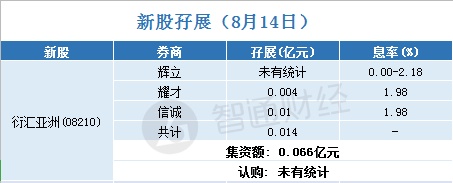 截至8月14日,正在招股的新股中,辉立、耀才、信诚3家券商为香港的交易商经纪衍汇亚洲(08210)借出孖展金0.014亿港元,认购未统计。具体情况如下:
