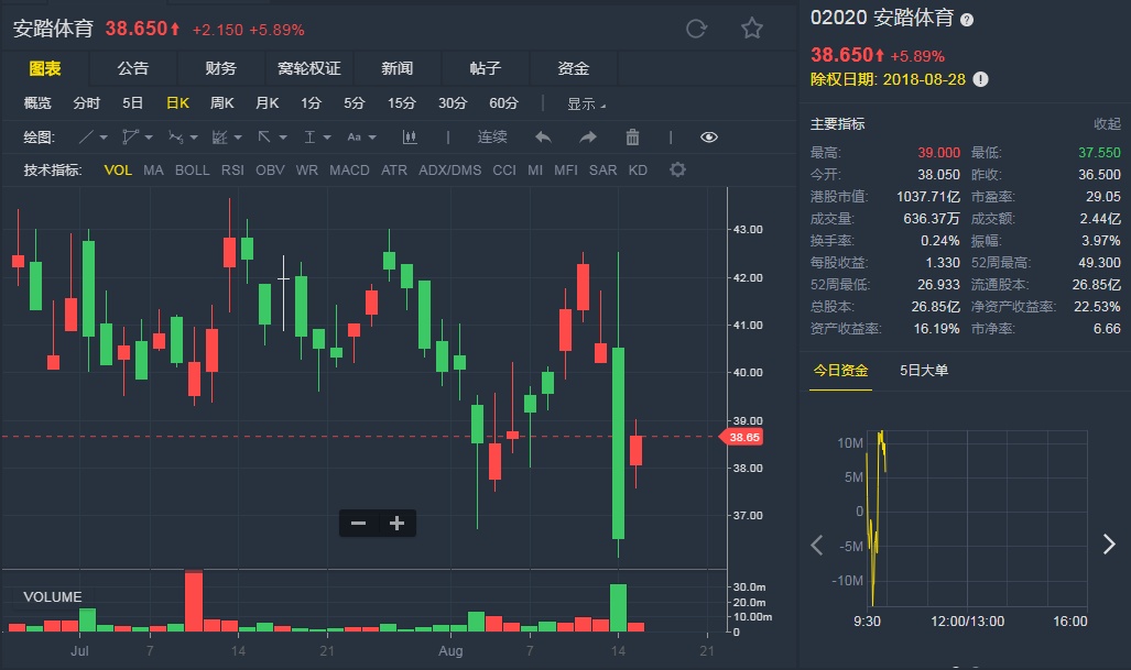 截至8月15日,安踏体育(02020)涨5.89%,报38.65港元。