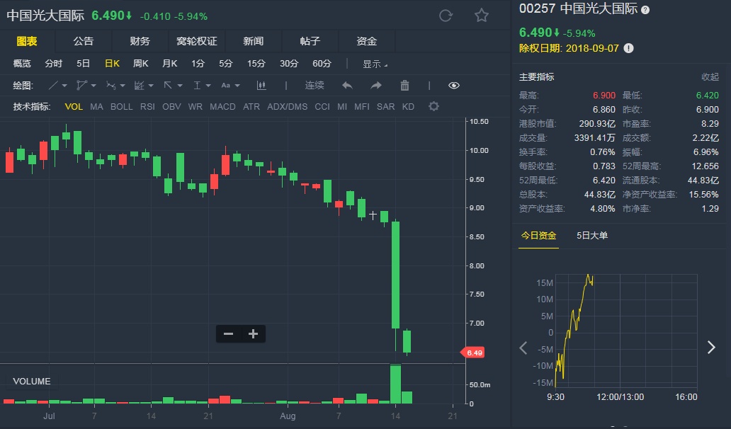 截至8月15日,光大国际(00257)跌5.94%,报6.49港元。