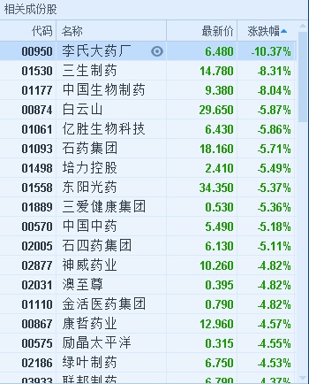 智通财经APP获悉,医药板块普跌,截至11时33分,李氏大药厂(00950)跌10.37%,报6.48港元,三生制药(01530)跌8.31%,报14.78港元,中生制药(01177)跌8.04%,报9.38港元,白云山(00874)、东阳光药(01558)、石四药(02005)均跌逾5%。