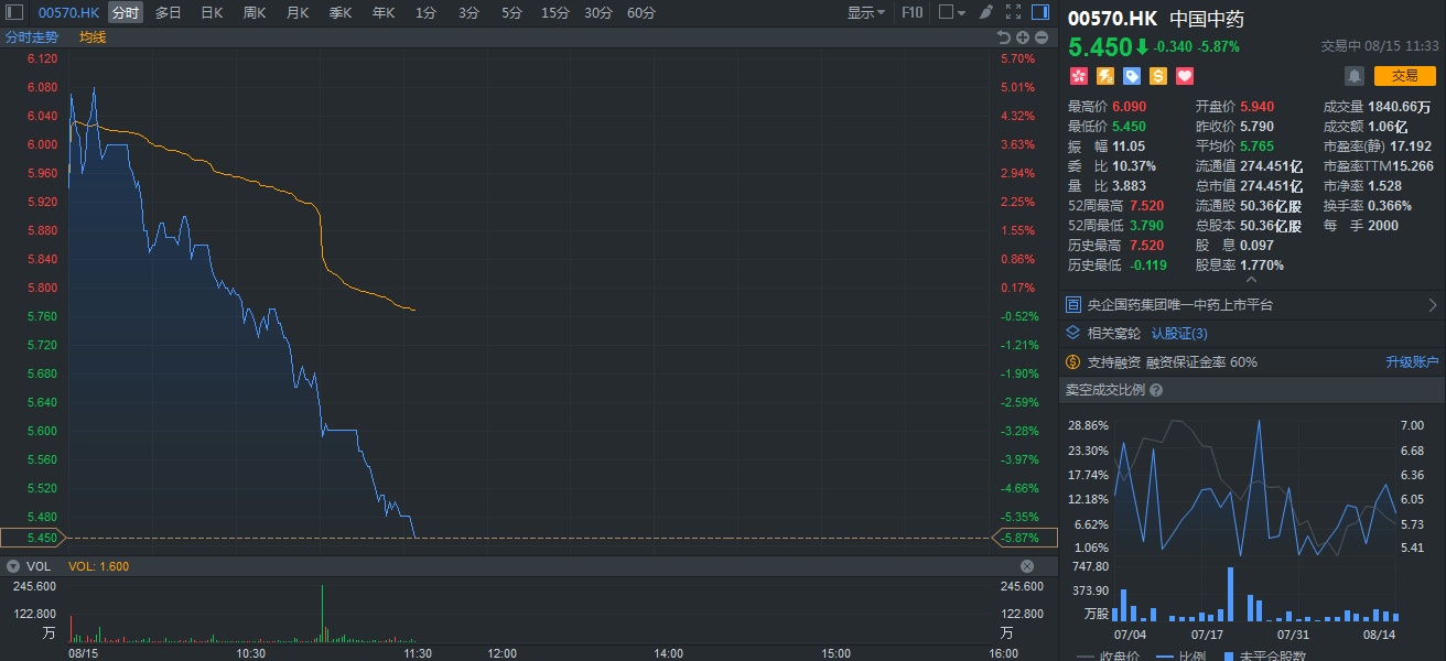 中国中药如此向好的业绩,可仍未抵消市场“恐慌”。智通财经APP观察到,尽管其早盘高开近3个点,盘中一路冲至最高的6.09港元,但此后便随着整个医药板块而陷入划水,截至发稿,跌幅超过了5.87%,令人意外至极。