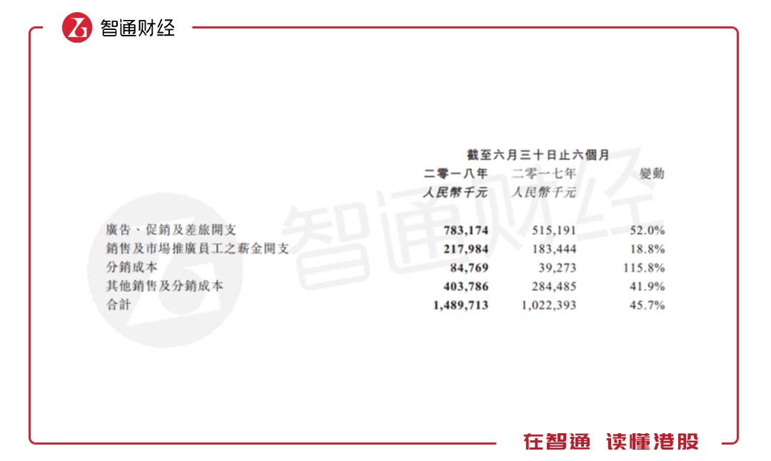先说销售成本。期内,该公司的销售及分销成本约为14.89亿元,较去年同期的10.22亿元增长45.7%。销售及分销成本占营业额的比例为27.3%,较去年同期26.2%增加1.1个百分点,给出的原因“老三样”:市场推广成本增加;两票制带来的费用问题;新收购的资产费用并表。