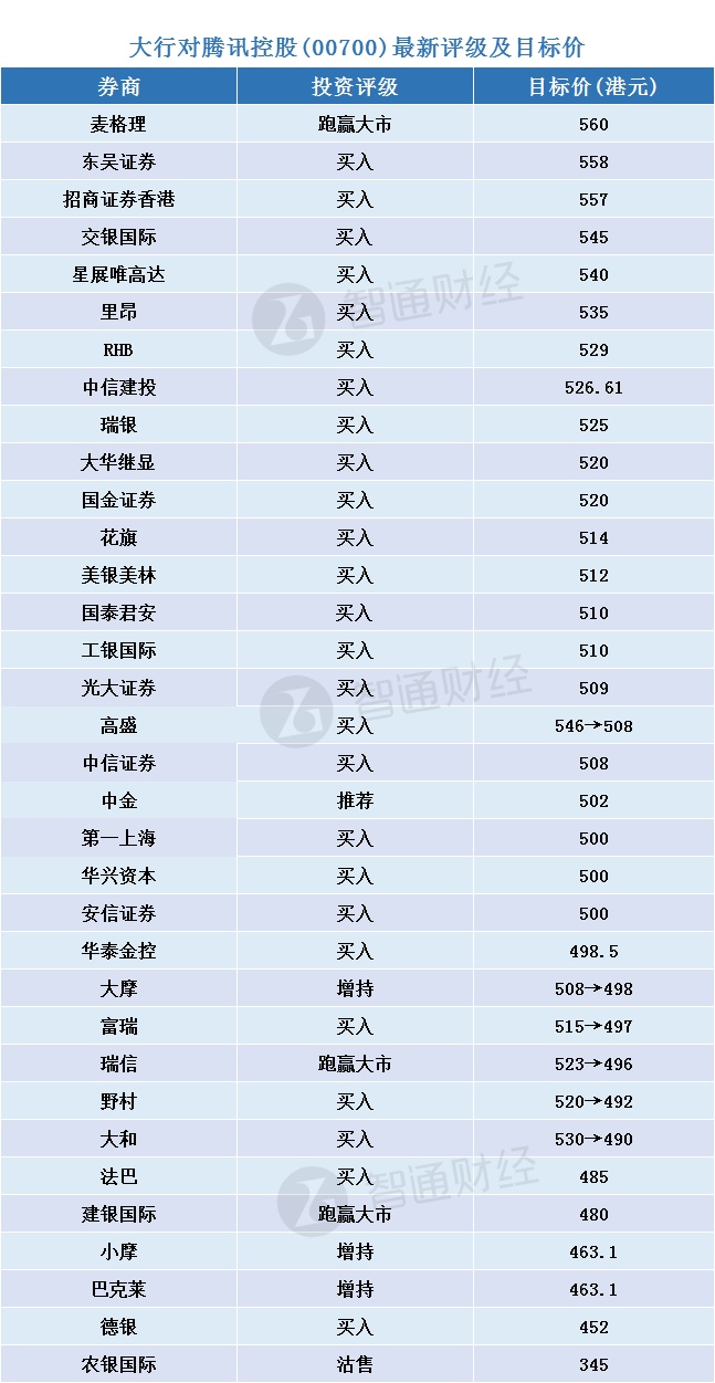 智通财经APP整理,大行对腾讯控股(00700)最新投资评级及目标价如下: