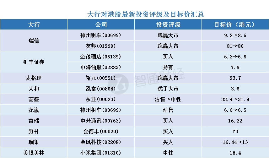 一、大行对腾讯控股(00700)最新投资评级及目标价