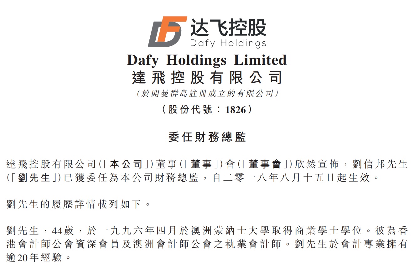 据公告显示,刘信邦有着逾20年会计专业工作经验,此前任职于港交所创业板上市公司中国金典(08281)之首席财务官,于2016年7月为中国金典成功在香港联合交易所上市立下汗马之功,彼时中国金典融资港币1.1亿元。