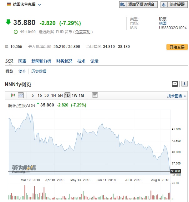 智通财经APP获悉,腾讯(00700)8月15日晚间公布二季度业绩不及预期,截至北京时间19:16分,德国法兰克福市场上腾讯预托证券出现大幅跳水,截至北京时间19:10分,报35.88欧元,跌2.82欧元,跌幅为7.29%。其股价折合港元(实时汇率比为8.8818)约为318.7港元。而斯图加特市场跌幅更深,达8.94%,折合港股约报298.9港元。