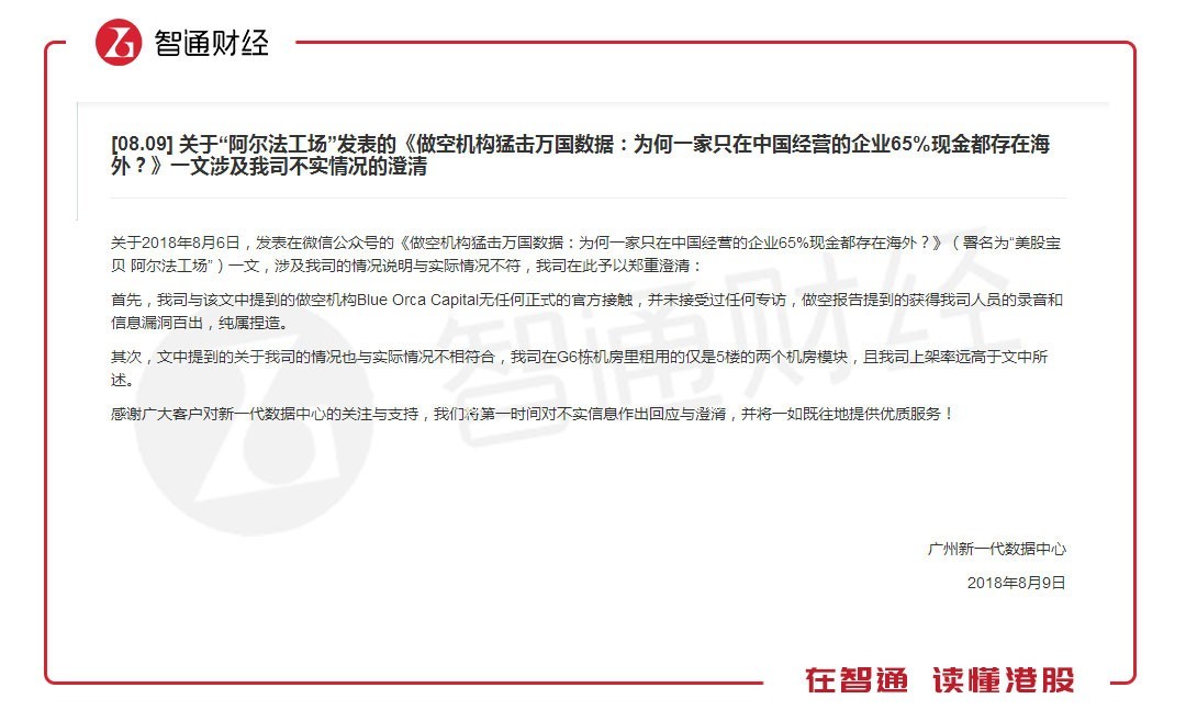 随后,广州新一代数据中心(GZIDC)便就此文做出辟谣,表示做空报告提到的获得公司人员的录音和信息漏洞百出,纯属捏造,GZIDC与Blue Orca无任何正式的官方接触,且并未接受任何专访,文中提到的关于我司的情况也与实际情况不相符。