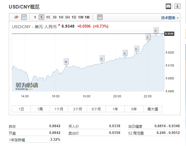在岸人民币对美元即期汇率接连跌破6.92和6.93关口,截至北京时间23时00分左右,一路贬至6.9348,跌506个基点,跌幅为0.73%。