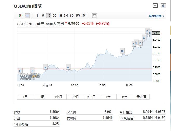 8月15日白天,人民币对美元汇率曾接连跌破6.89、6.90、6.91、6.92和6.93五个关口。