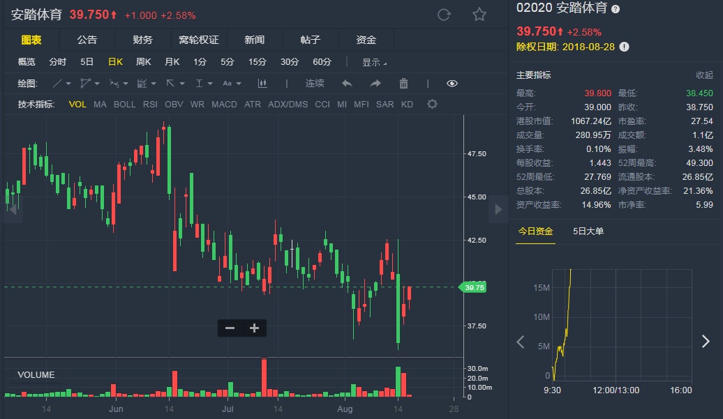 截至8月16日,安踏体育(02020)涨2.58%,报39.75港元。