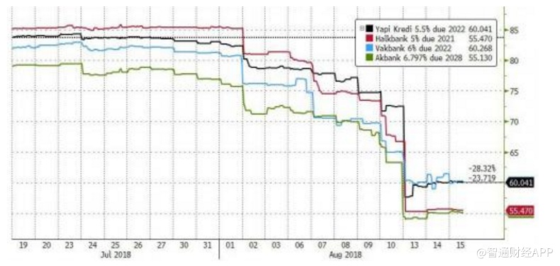 上周五,土耳其里拉兑美元跌幅扩大至逾13%,续刷历史新低,年初以来跌幅已近40%。因担心里拉今年的暴跌将使贷款人难以偿还以美元计价的债务或延期还款展期,土耳其银行发行的众多债券亦大幅下挫,于周一跌至历史低点。Yapi Kredi Bankasi的债券是受冲击最严重的,在过去一周中兑美元下跌30美分。