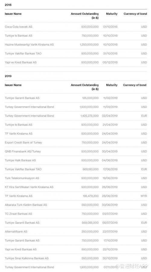 智通财经APP获悉,数据显示,土耳其主要的企业、金融机构和政府正面临至少160亿美元的“外币债券墙”,而这些巨额债券将于明年年底到期。其中大部分是由土耳其金融机构发行的债券,包括发行时价值至少1亿美元的传统债券和伊斯兰债券。