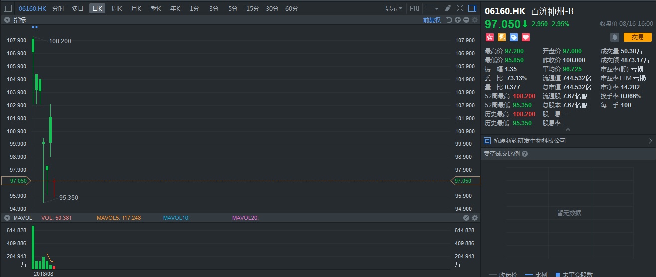 不过,小幅度回暖并未让个股们雨露均沾,比如港股市值最大的未盈利生物医药企业——百济神州-B(06160),在上市后一分钟内便遭遇破发的“悲情”下,股价迟迟未能向业界期待的那面,反而是越挫越勇。截至8月16日收盘,该股重演其美股走势,也跌去近3个点,收报97.05港元。7个交易日内,市值蒸发近85亿港元。
