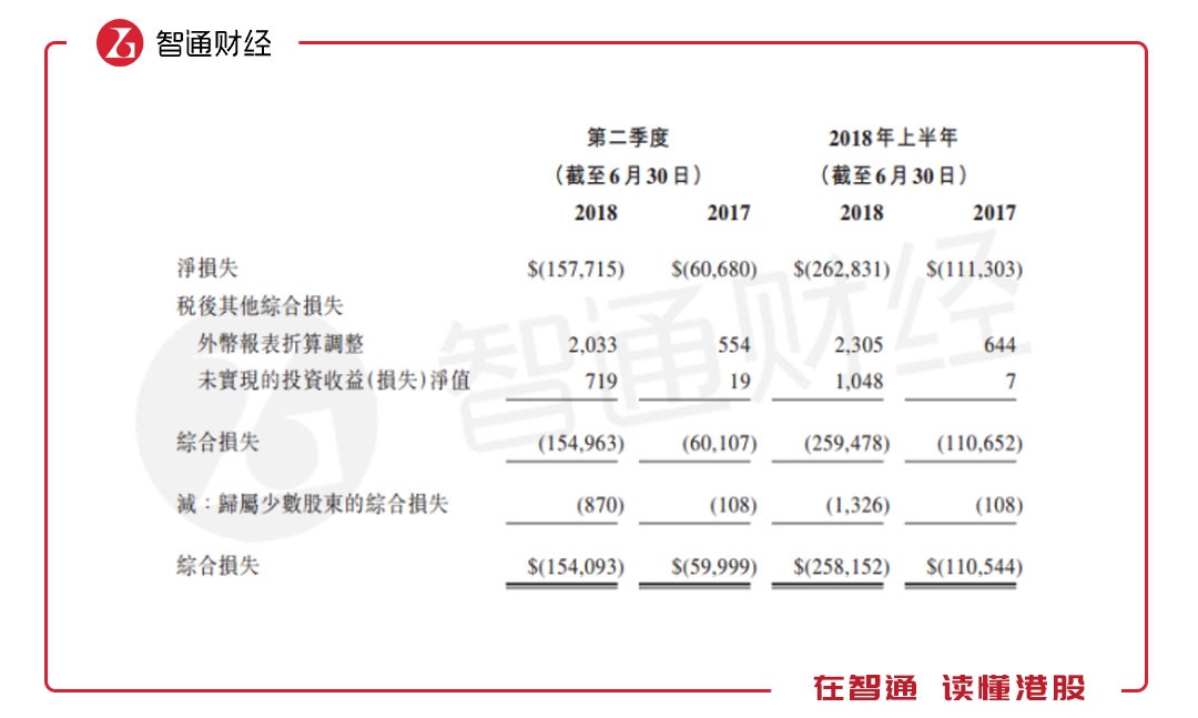 智通财经APP观察到,截至2018年6月30日止上半年,该公司总收入8534.8万美元,期内归属公司的亏损为2.61亿美元,亏损同比扩大135%。而二季度,该公司总收入5280.4万美元,期内归属公司的亏损为1.57亿美元,亏损同比扩大159%。
