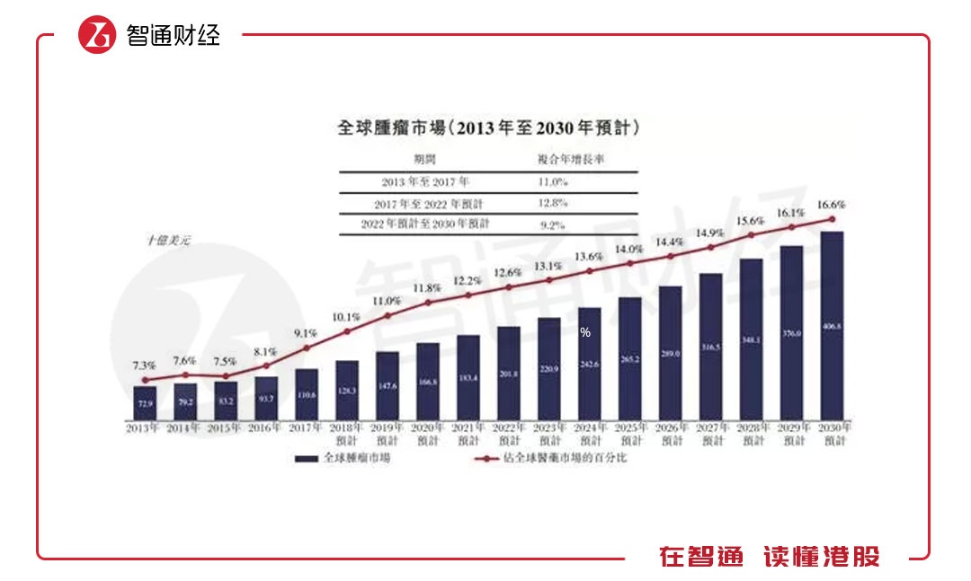智通财经APP观察到,截至20117年,由于科技进步、新疗法上市及老龄化人口日益增长,全球肿瘤药物市场产生销售额为1110亿美元,占全球医药市场的9.1%;全球肿瘤药物市场的销售预期在2030年将达到4068亿美元,占全球医药市场的16.6%。