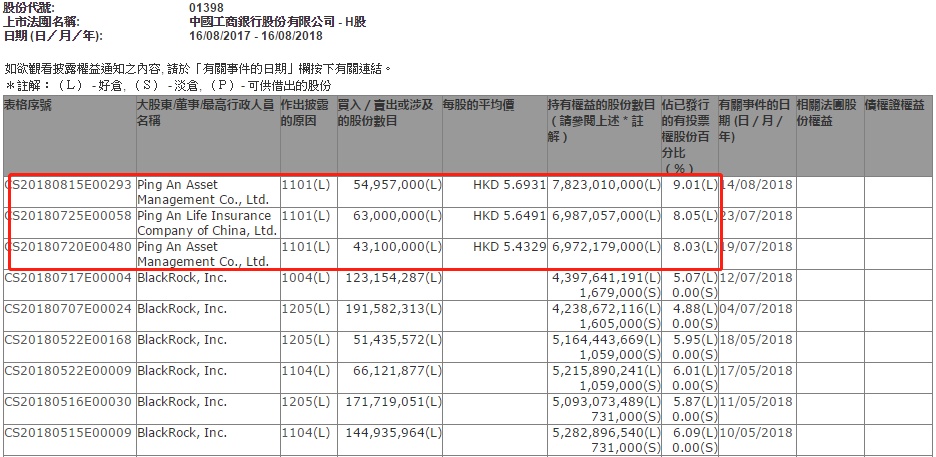 7月19日以来,平安资产管理分三批增持工商银行(01398),总共增持约1.61亿股。