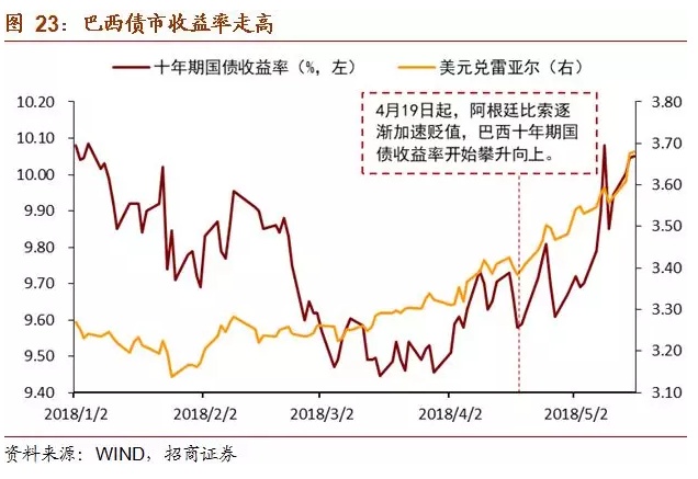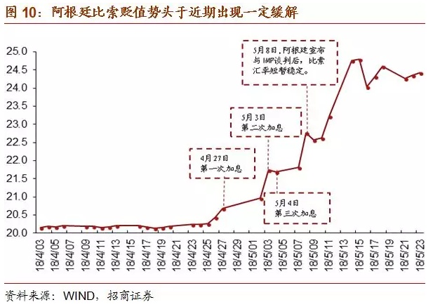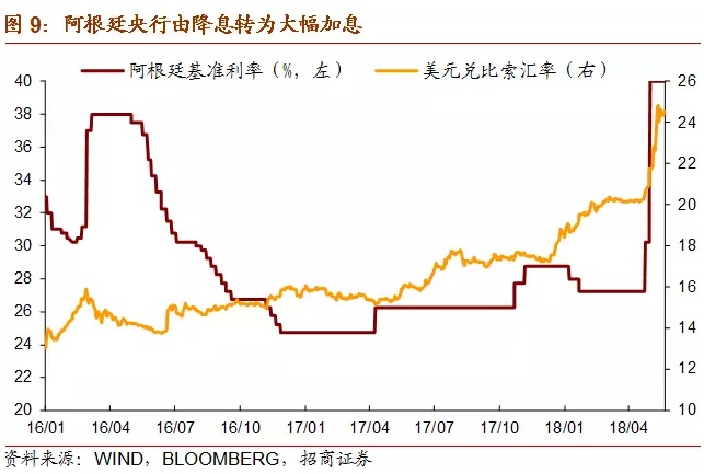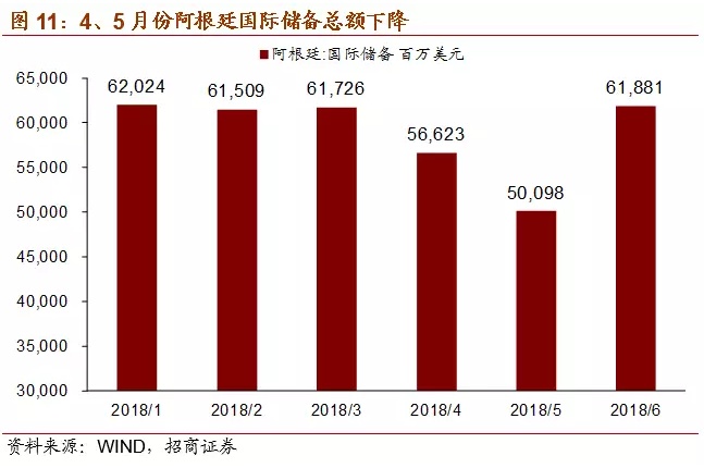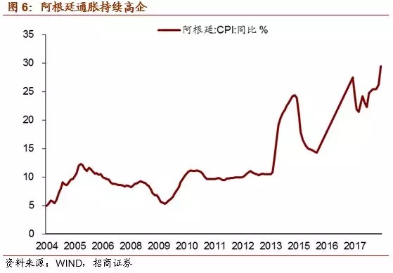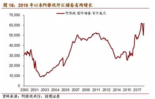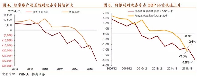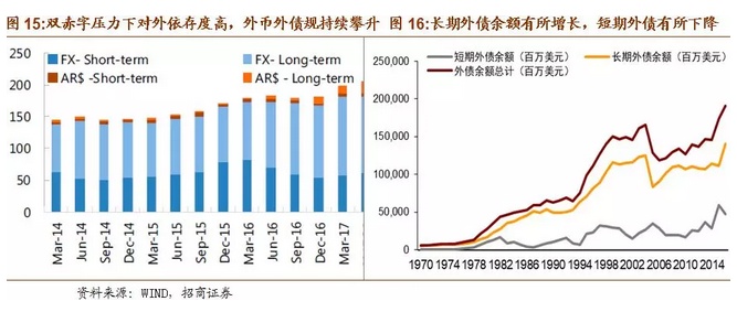 以下为正文内容: 一、阿根廷面临的“内忧外患” 1、内忧重重 (1)财政赤字严重 财政收入增长乏力,财政支出存在刚性,财政赤字问题严重。过去的半个多世纪以来,阿根廷政府更迭高达几十次,前后不一致的政策无法为经济发展提供保证,政治不稳定使得政府无暇顾及经济发展,次贷危机后其经济增长速度更是出现大幅下滑并一度出现负增长。政府频繁更迭的另一个后果是总统候选人为拉选票,纷纷采取激进的财政政策,财政支出规模不断扩大。过去十年,阿根廷政府财政支出总额逐年攀升,政府支出增速在2014年达到最高44.8%。尽管增速从2015年开始有所下降,但仍保持在20%以上。高额的政府支出中占比最大的部分为经常支出,主要包括公共消费和运营成本、物业支出、社保支出、其他流动支出、向私营部门以及公共部门的经常项目转账等,其次为资本转移支出和资本支出,占比保持在15-20%和10%左右。这样的支出结构导致如果总统打算压缩财政开支的话,一定会带来选民的极力反对。有鉴于此,现任总统马克里上台时虽然曾承诺实施削减赤字的财政紧缩政策,然而数据显示2016年财政支出仍然出现陡增,导致财政赤字占GDP比重快速上升至-3.4%。 (2)经常项目赤字,依赖国际资本流入进行融资 阿根廷国土面积近300万平方公里,气候温和,土地肥沃,人均可耕地面积辽阔,自然资源与矿产资源皆十分丰富。然而阿根廷的人口数量只有4300多万,劳动力较为稀缺。据世界银行统计,2017年阿根廷劳动力总计不足两千万人,稀缺的劳动力使得阿根廷难以像东南亚国家一样发展劳动密集型产业,但低的储蓄率和投资率导致阿根廷的工业发展水平较低。 金融危机后,阿根廷经常项目赤字规模不断扩大,需要依赖国际资本流入来融资。从2017年阿根廷出口商品结构来看,占比最多的是动植物产品和食品饮料烟草,分别占29.4%和22.4%。这样的出口结构容易受到商品价格波动的影响,贸易和经济的稳定性差。反观进口端,进口商品结构明显集中于附加值更高的机电产品、运输设备以及化工产品等,分别占据进口总额的27.8%、22.2%以及13.6%。2017年阿根廷国际收支逆差达307.92亿美元,比2016年扩大1倍,其中货物服务贸易逆差为153.92亿美元,向海外支付资本利息159.06亿美元。阿外债规模为2329.52亿美元,同比增长28.5%。2016年,阿根廷经常项目差额占GDP比重达到-2.7%,阿根廷财政盈余占GDP比重达到-3.4%,呈现典型的“双赤字”特征。 政府财政赤字和经常项目赤字的双重重压,反映出阿根廷对外资依赖程度高、内生增长和产出动力不足的增长模式。 (3)通胀高企、主权信用风险遗留问题使投资者信心不足 阿根廷持续的严重通胀阻碍了国内经济发展,同时也影响货币的对内和对外价值稳定,是阿根廷比索长期趋势性贬值的一个重要原因。2017年以来,阿根廷的严重通胀似有愈演愈烈之势,目前已升至25%。由于高通胀与货币贬值很容易形成恶性循环,阿根廷的通胀前景仍不容乐观。并且,阿根廷还存在着主权信用风险的隐患。2001年,阿根廷国内爆发了一场经济和社会危机,自此深陷债务违约、通胀飙升和失业率激增的泥潭。2002年主权债务违约事件发生后,阿根廷政府曾于2014年再一次出现违约,使得阿根廷政府“恶名远扬”。 2、外患加剧 (1)美国长债收益率为代表的国际利率水平上升进一步增加阿根廷还本付息的难度 不可否认,外围环境的变化是阿根廷乃至所有新兴市场当前都面临的不利因素。美联储加息和长端利率的上行给新兴市场、特别是依赖国际资本和外债的国家带来较大压力,比如阿根廷。从2017年阿根廷国际收支情况看,经常项目逆差达307.9亿美元,比2016年扩大1倍,其中货物服务贸易逆差为153.9亿美元,向海外支付资本利息159.1亿美元,即一半的逆差是由于支付利息而产生的。随着美元利率的上升,未来阿根廷借外债或借新还旧的成本将显著增加,从而造成阿根廷财政状况和经常项目的进一步恶化。 (2)强势美元施压比索 近期的货币贬值也并不是阿根廷独有的现象,3月以来,美元指数上涨6.3%,一度升至96水平,显示资本回流美国,这可能是阿根廷比索动荡最直接的导火索。作为美元的背面,大部分新兴市场货币近期都出现了不同幅度的贬值,而贬值加剧了新兴市场输入通胀的压力,新兴市场基本面预期的恶化可能进一步引发资本回流发达国家,从而使新兴市场陷入“美元走强&资本外流”的恶性循环,因此美元指数的强势也是造成本轮阿根廷比索动荡的导火索之一。 (3)中美贸易战:“大象打架,小草受伤” 中国宣布“大量增加自美购买商品和服务”,可能使得巴西和阿根廷的经常项目状况和经济增长雪上加霜。巴西对华出口占其总出口的21.8%,阿根廷对华出口占总出口的7.4%,巴西和阿根廷对华出口农产品分别占对华总出口的44.1%和70.4%,而这单一品类单一国别的出口在两国总出口中的比重分别为9.6%、5.2%。巴西对华农产品出口占其经常项目收入的比重也逐步上升,目前已达到8%以上,可见巴西的出口、经常项目收入对中国依赖度较高,阿根廷对华出口则更加集中于农产品。中国“大量”增加从美国的农产品进口,必然意味着显著调整将进口结构,可能减少从巴西、阿根廷等与美国农产品存在竞争的国家的进口,对巴西和阿根廷的出口和经济基本面带来负面影响。近期的比索动荡也是外汇市场对此担忧的一个反应。 二