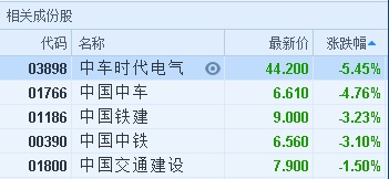 智通财经APP获悉,高铁基建股全线下挫,截至11时15分,中车时代(03898)跌5.45%,报价44.2港元,中国中车(01766)跌4.76%,报6.61港元,中国铁建(01186)、中国中铁跌逾3%。