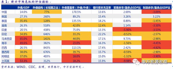 根据上文梳理的新兴经济危机的传导逻辑,我们认为可以从以下几类指标来评估新兴经济体的潜在危机,分别为:外债占GDP之比、外债覆盖率、外债长短期结构、贸易赤字占GDP比例、财政赤字占GDP比例。总体来看,在巴塞尔协议Ⅲ的规制下,当前新兴经济体的银行抗风险能力比过去有所提升,但是外债与财政贸易双赤字问题仍旧引发外债危机的核心因素。基本结论如下: