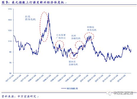 2、美元指数上行引发新兴经济体危机。每当美元指数上行,往往伴随着美联储的紧货币政策周期,海外美元存量减少,导致流入新兴经济体的外资下滑或者逆转,依靠资本账户融资的方式受限。由于危机国家大多实施固定汇率制(如东南亚国家、阿根廷、巴西、多数拉美国家等,墨西哥为“爬行钉住美元”制度),美元指数走强、本币被动升值导致贸易出口下挫,央行需耗费大量外储以稳定汇率贬值预期。由于经济预期的恶化,以及财政赤字问题,政府信用受损不足以借新债还旧债。一旦外储耗尽,债务危机大多以放弃固定汇率制告终,届时本币大幅贬值,经济增长受到严重冲击。这一点在94-95年墨西哥金融危机、97年亚洲金融危机、99年巴西金融危机、2001-2002年阿根廷金融危机等均有明确的体现。