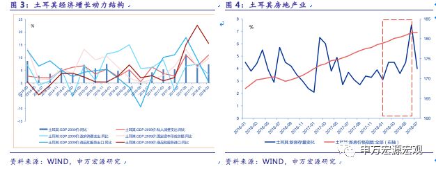 1、全球宽松的货币环境为土耳其经济发展提供支撑,经济表面繁荣。国际金融危机爆发后,美国、欧元区等主要经济体实施量化宽松的货币政策,国际流动性充裕,大量热钱流入土耳其,为其经济增长奠定基础。数据表明,2014年以来土耳其季度GDP增长一直维持在较高的水平(平均5.59%),2018年一季度GDP增速更是达到了7.36%。然而,这只是表面上的繁荣:一方面,17年三季度后贸易出口增速下滑的趋势一直在延续;另一方面,私人消费与固定资产投资虽然支撑经济上行,但是有大部分资金流入了基建和房地产业,实体经济的发展并不乐观。