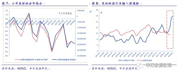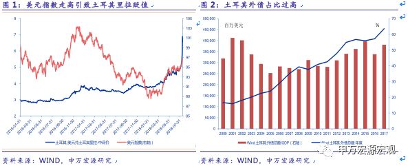 2、贸易冲突加剧与牧师事件引爆危机。(1)8月初,美国USTR宣布重新评估对土耳其的特惠免税待遇(GSP),冲击16.6亿美元商品。随后,土耳其宣布对煤炭、纸张、坚果、威士忌、汽车及机械等17.8亿美元美国商品征收进口关税。8月10日特朗普称将对土耳其加倍征收钢铝关税。(2)2016年7月,土耳其发生推翻总统埃尔多安的未遂军事政变,10月土耳其逮捕美籍牧师安德鲁·布伦森,美国和土耳其的关系趋势转冷。2018年8月,双方围绕是否释放布伦森再起争端。美国宣布对土耳其司法部长和内政部长实施制裁。作为还击,土耳其将冻结美国司法部长和内政府部长在土耳其的资产。(3)在土耳其长期维持贸易逆差的背景下,美国与土耳其的贸易冲突和牧师事件成为引爆土耳其危机的导火索,市场的避险资产配置则进一步强化了里拉的贬值预期。8月8-10日美元指数连续上涨,涨幅为1.28%,至8月14日收于96.6668;同期,土耳其里拉大幅贬值,至15日美元兑里拉汇率为6.89,与7月末相比进一步贬值25.4%。