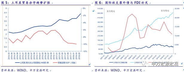 3、里拉贬值是土耳其增长模式弊端的集中显现。就贬值原因而言:(1)高通胀。18年4月份以来,美元指数结束低位震荡开始上行,土耳其里拉被动贬值。由于实体经济不佳,贸易竞争力较低,进口激增引致贸易逆差的格局延续,在国际油价趋势上行的背景下引发了输入型通胀问题。此外,土耳其的财政赤字问题迟迟没有得到解决,也推升通胀预期。数据表明,CPI同比增速由18年3月10.23%大幅攀升至7月的15.89%,进一步对里拉产生贬值压力。(2)美国货币政策转向。金融危机之后,土耳其的经济增长主要受惠于全球宽松的货币政策环境。2015年末美联储开启新一轮加息周期,17年10月实施缩表。美国货币政策正式由松转紧,叠加17年末的减税激励和越演越烈的贸易争端,海外美元回流美国已成大势。同期,土耳其仍旧实施较宽松的货币政策(流动借款利率为0),且多利率框架改革迟缓。在此背景下,土耳其依靠资本账户来平衡国际收支的老路越走越窄。数据表明,2016年之后流入土耳其的FDI已经趋势向下,同期美元利率上行也增大土耳其的外债压力。