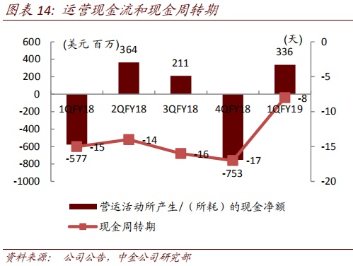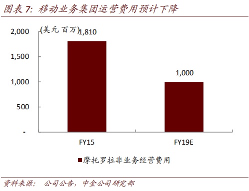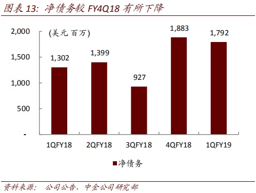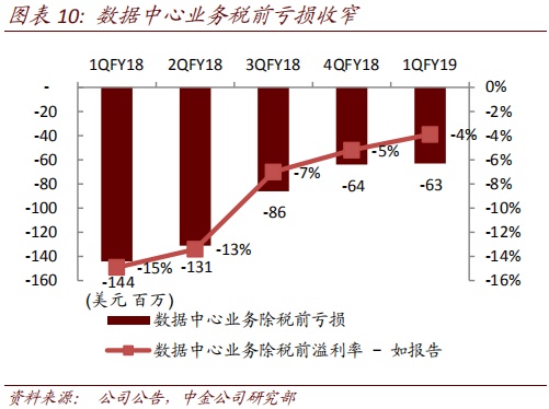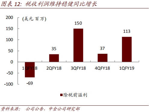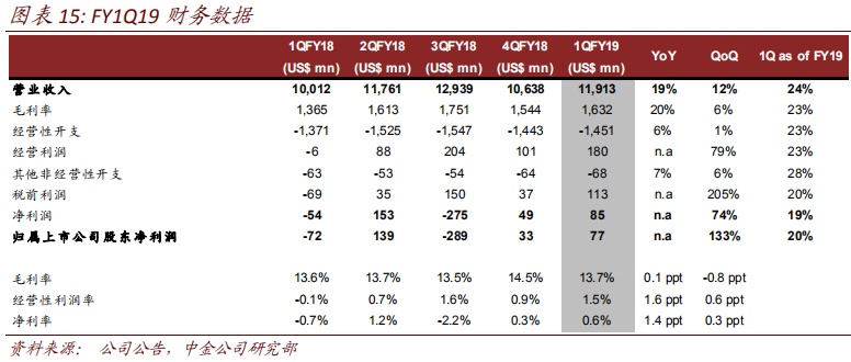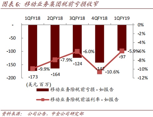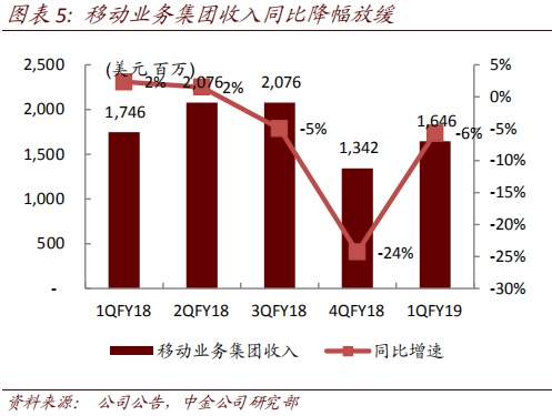 手机业务亏损收窄。手机业务产品结构优化带动拉美和北美市场强劲增长,成本结构改善。1QFY19移动业务收入16.5亿美元,同比降幅收窄,税前亏损收窄至9700万美元。