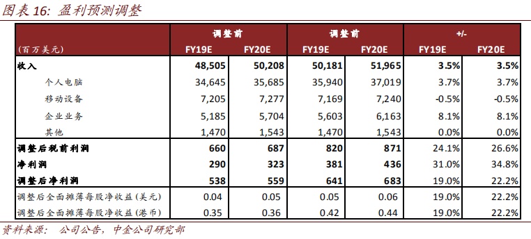 手机业务焦点从销量转为盈利。联想战略性地收缩手机业务版图,聚焦于有渠道竞争优势的个别市场(主要是北美、南美和欧洲),希望在稳定销量的同时实现有效地减亏。1QFY19手机出货量和收入分别同比下降8%和6%,但运营费用同比下降28%,税前亏损同比减少44%。我们预计FY19年手机收入持平,预计税前亏损有望同比收窄50%。联想此举与我们之前观点一致,减少手机对PC和服务器等优势业务的拖累。