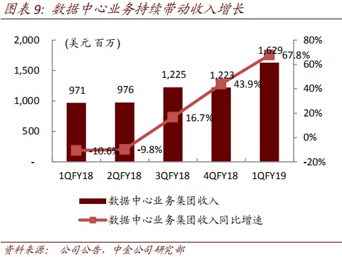 FY1Q19数据中心业务收入16.29亿美元,同比增长67.8%,主要由于公司将业务重心转移至高性能计算产品。随着公司持续巩固市场领先地位,我们预计数据中心收入有望持续提升,服务、存储和网络服务持续增长。