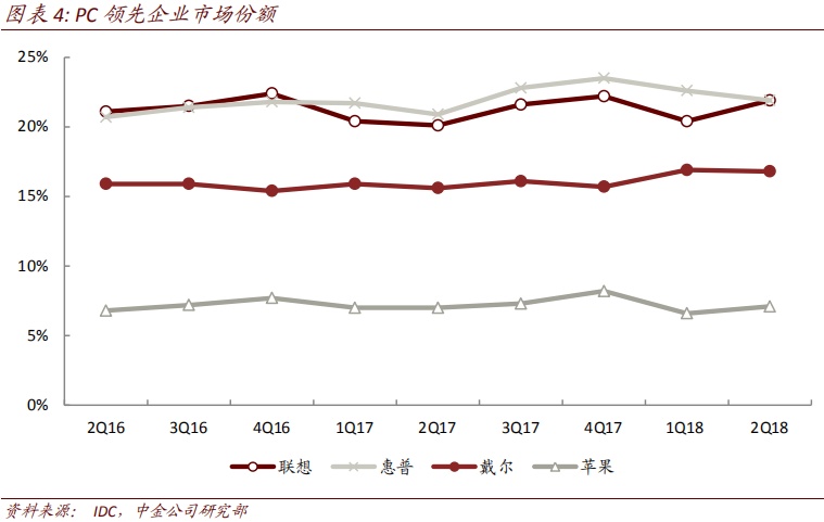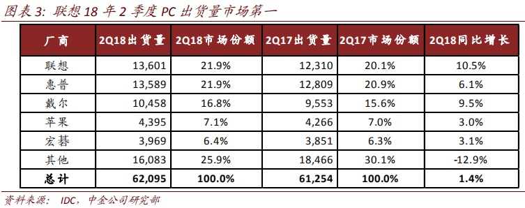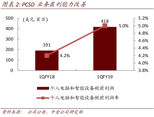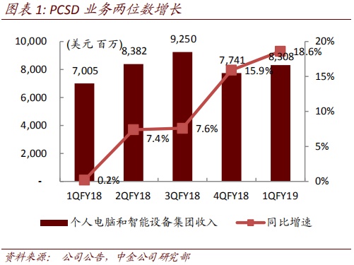 个人电脑和智能设备(PCSD)业务重拾增势。联想集团PCSD业务持续稳健增长,主要由于公司PC市场领先地位,PC收入同比增长18.6%至83.08亿美元。IDC数据显示,联想集团18年2季度(即公司1QFY19)PC出货量重回市场第一。