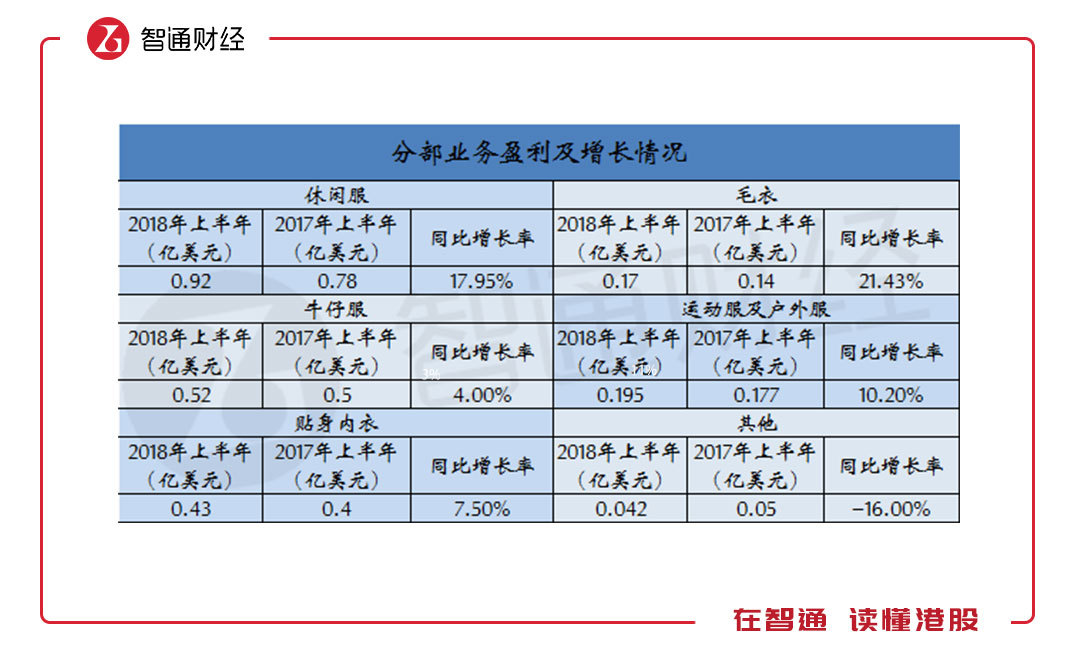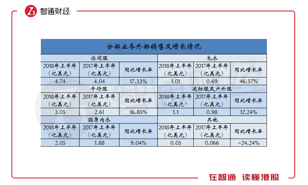 财报显示,公司主营业务在上半年取得了12亿美元的收入,同比增长17%。其中,休闲服、毛衣、牛仔服、运动服及户外服均取得10%以上的增幅,毛衣的增幅更是达到46.37%,突破亿元大关。