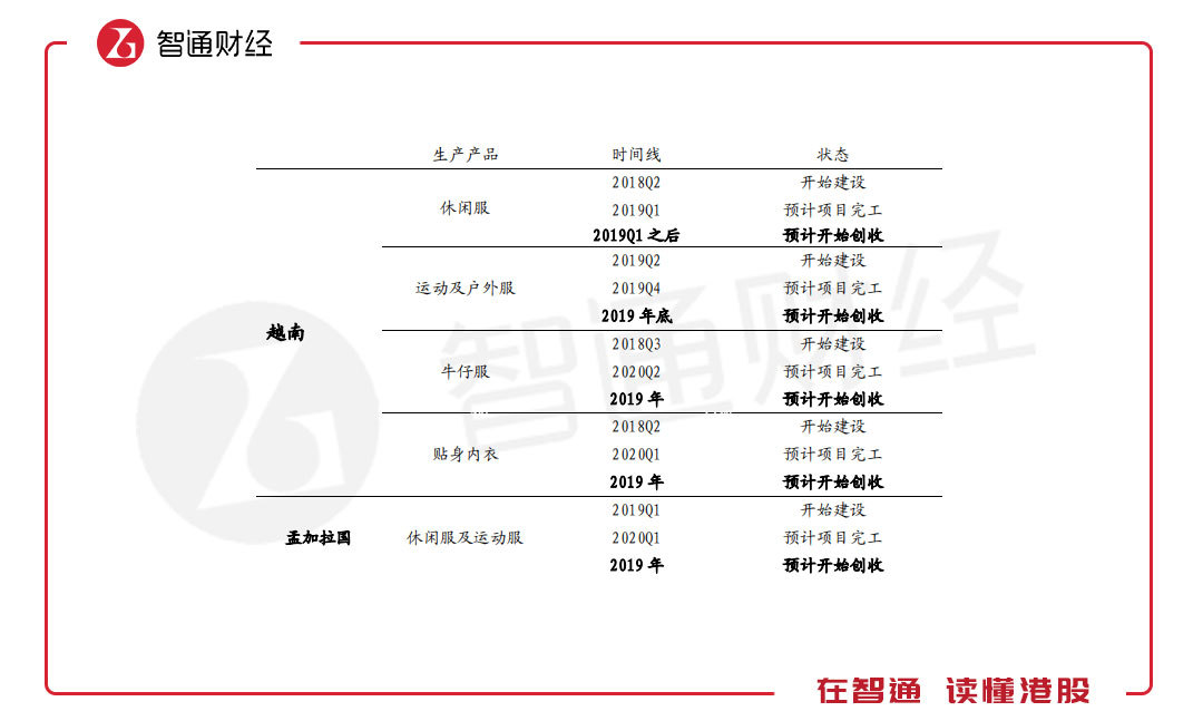根据公司的指引,公司计划在四至五年内实现产能翻倍。公司计划通过在越南及孟加拉分别增建四间及一间工厂以扩充产能,以落实迁至低成本国家的策略。同时公司正不断寻求上游垂直扩充的机会,并正在物色可供收购用地的合适地点。