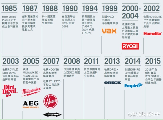 智通财经APP了解到,成立1985年,并在1990年上市的创科实业,最初只是一家代工厂,之后则通过不断收购扩张,成为了全球第二大电动工具及地板护理工具研发和生产商,2017年全球销售总额超过了超过60亿美元,完美地从“代工”转身为“自主生产”。