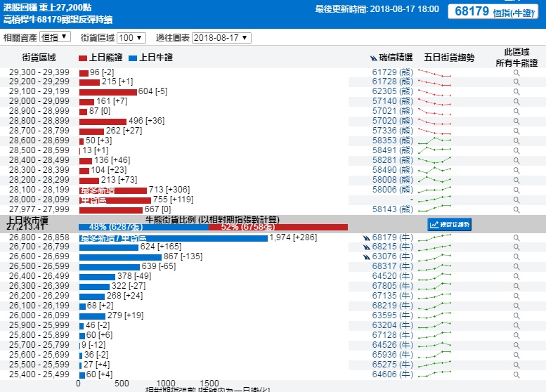 智通财经APP获悉,截至8月17日,恒指最新的牛熊街货比例为48:52。从瑞信恒指牛熊证街货分布图中得到的数据显示,熊证街货重货区在28000-28099区间,此区间最新的熊证数量为755张,比上一交易日增加119张;最多新增区间在28100-28199,比上一交易日增加306张。牛证中重货区在26800-26858区间,该区间最新牛证数量为1974张,比上一交易日增加286张。最多新增也落在这一区间。