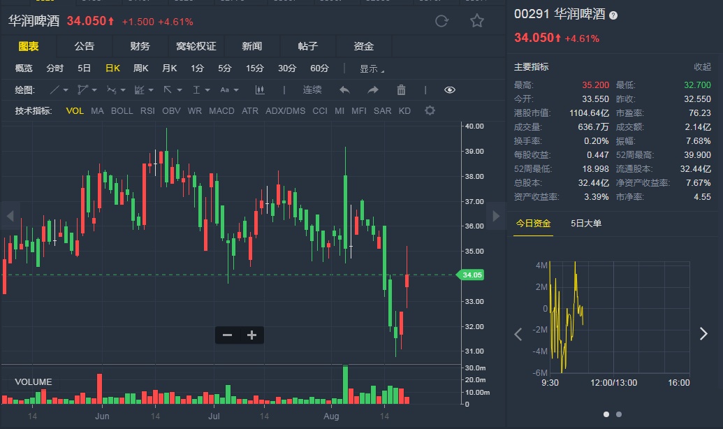 截至8月20日,润啤(00291)涨4.61%,报34.05港元。